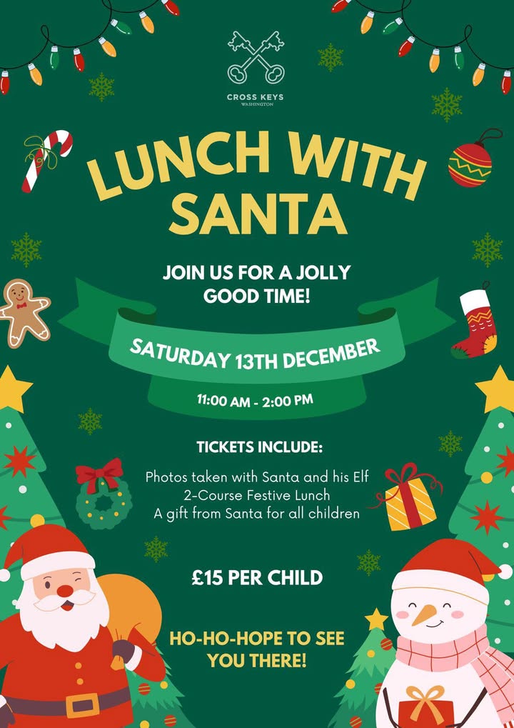 We have some very special visitors coming to the Cross Keys, Washington on Saturday 13th December. Santa himself and his top Elf are stopping by to spend time with us and meet our lovely customers and hear for himself what the children want for Christmas 🎅 This is a ticket only event which includes three hours of festive fun with Santa and his Elf, plenty of photo opportunities, two course lunch from our Festive Fayre menu for children and a special gift for every child from Santa himself 🎁 Spaces are limited so pop in to book your spot for plenty of sparkle, smiles and holiday cheer 🎄